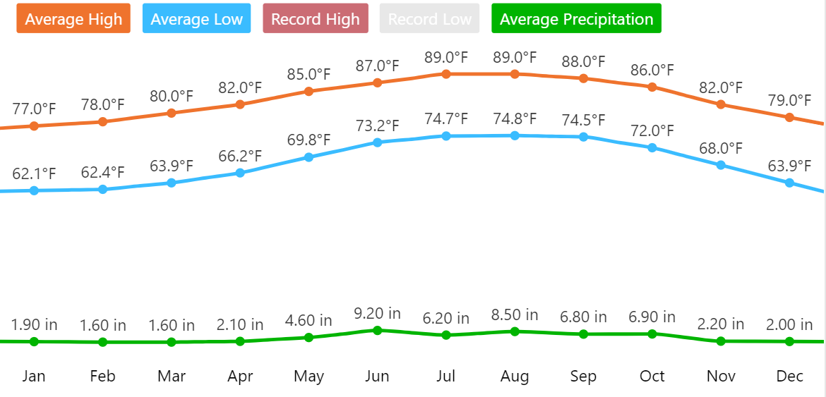 Jan 74°    Feb 74°     Mar 75°     Apr 78°    May 80°   Jun 83°   Jul 85°    Aug 86°    Sep 86°   Oct 83°   Nov 80°   Dec 77°